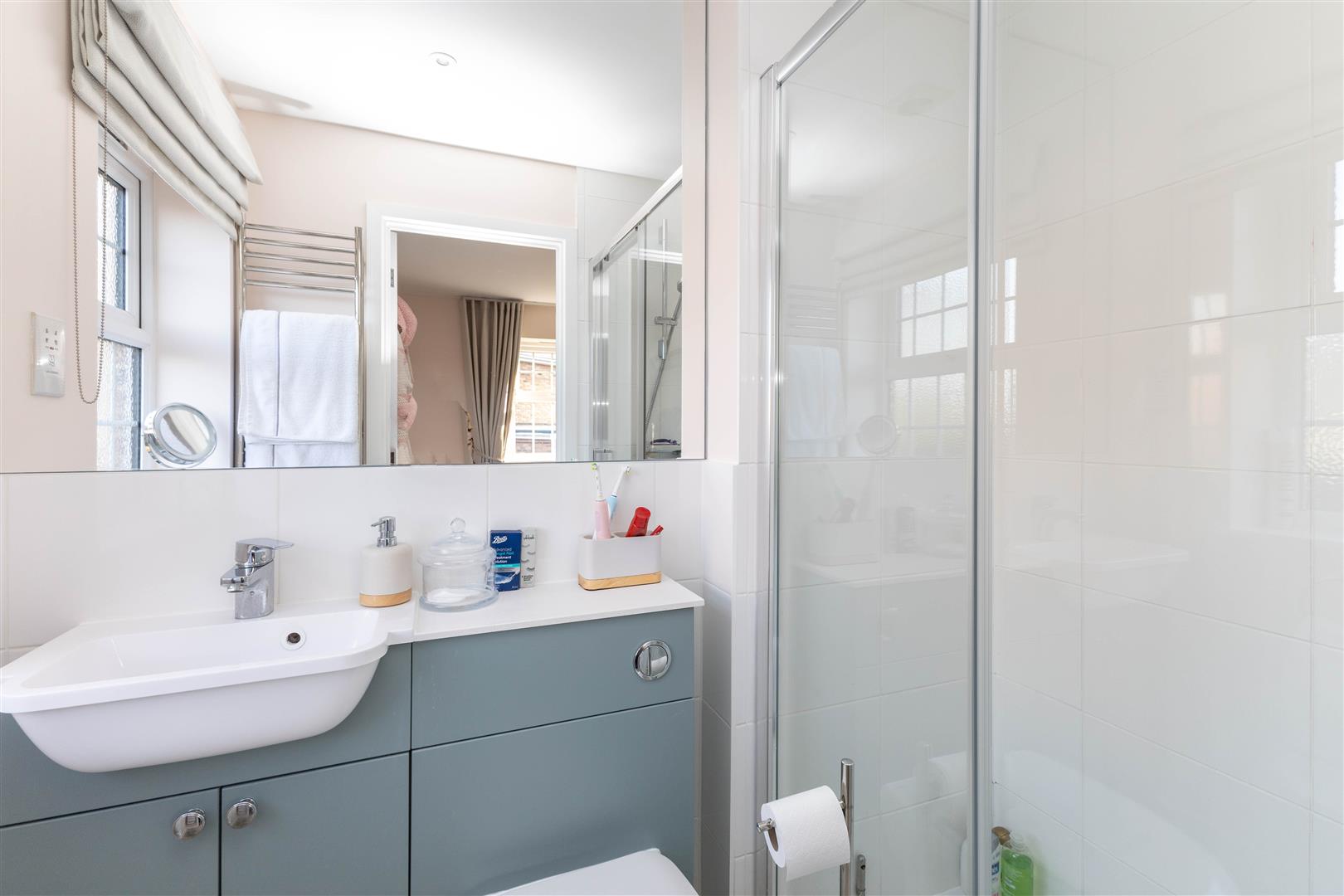 Comprising shower cubicle, low level w.c, vanity unit with inset wash hand basin, fitted mirror, shaver point, extractor fan, heated towel radiator, double glazed frosted window to the rear.