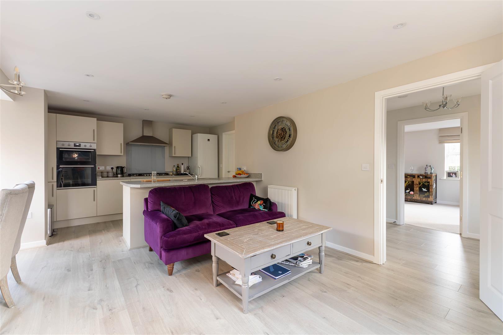 Comprising matching range of wall & base units, worksurface, inset stainless steel sink unit, inset gas hob with extractor hood, fitted eye level double oven, space for dishwasher, space for standing fridge/freezer, two radiators, LVT laminate flooring, inset ceiling spotlights, double glazed window & door. Door to