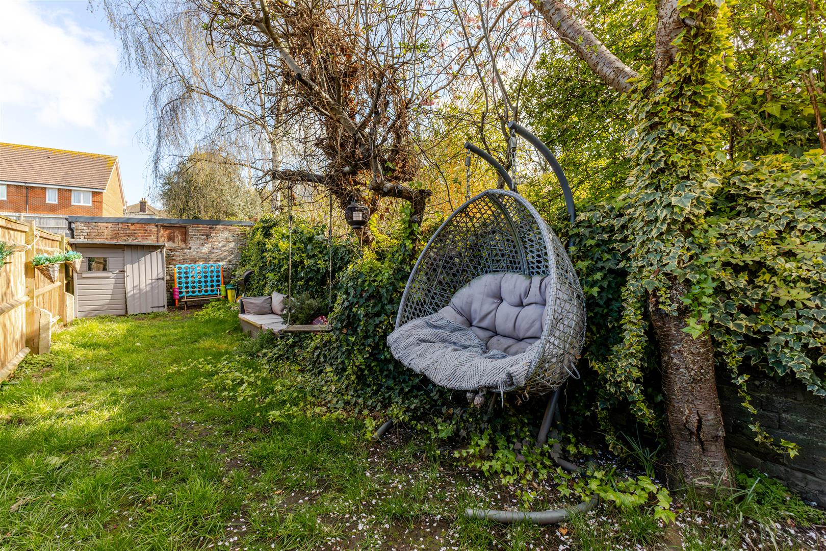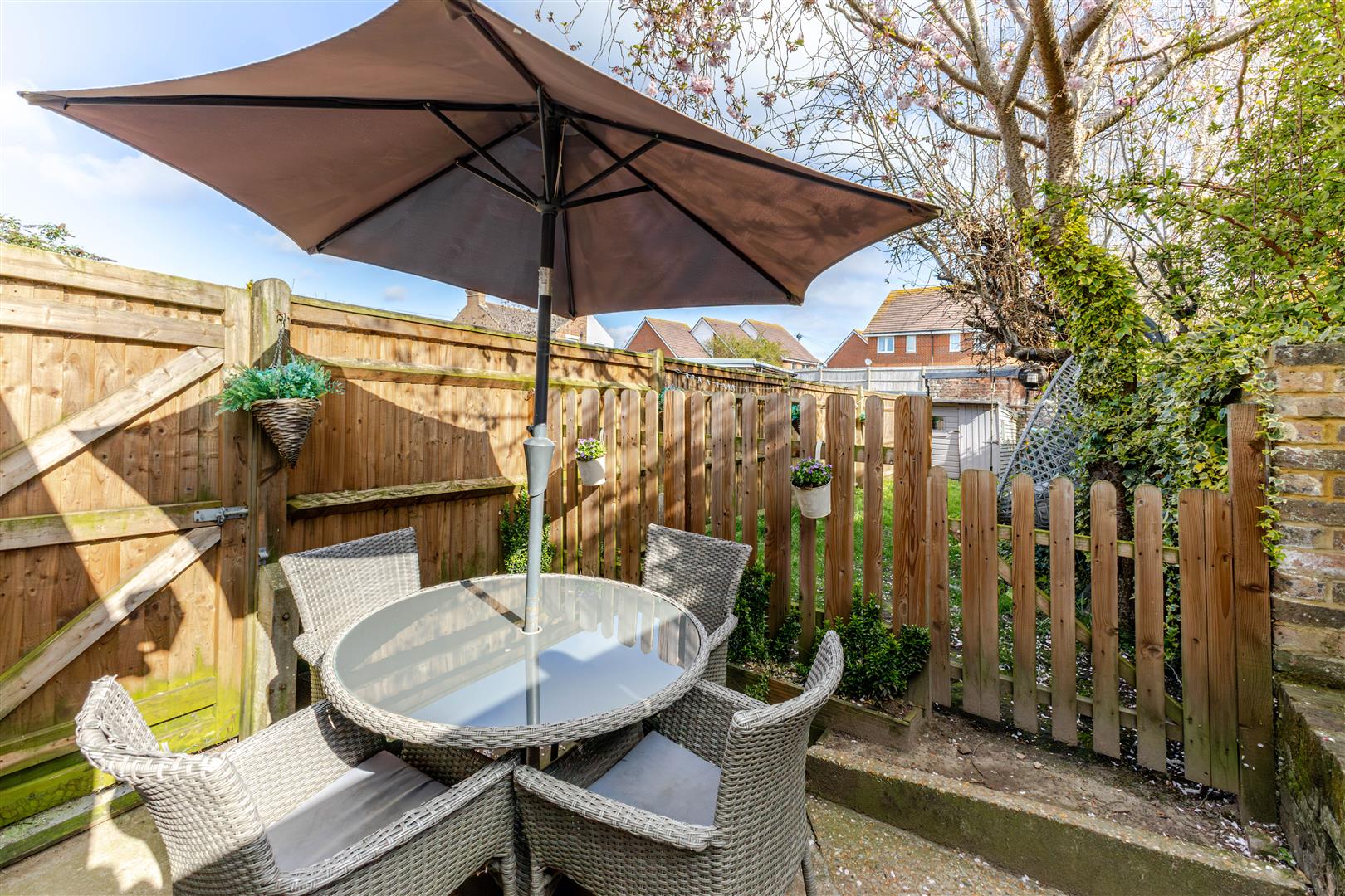 To the front there is a wall enclosed courtyard area and to the rear there is a patio area, gate leading to an area of lawn with timber shed, being enclosed by brick wall & fencing with gated side access.