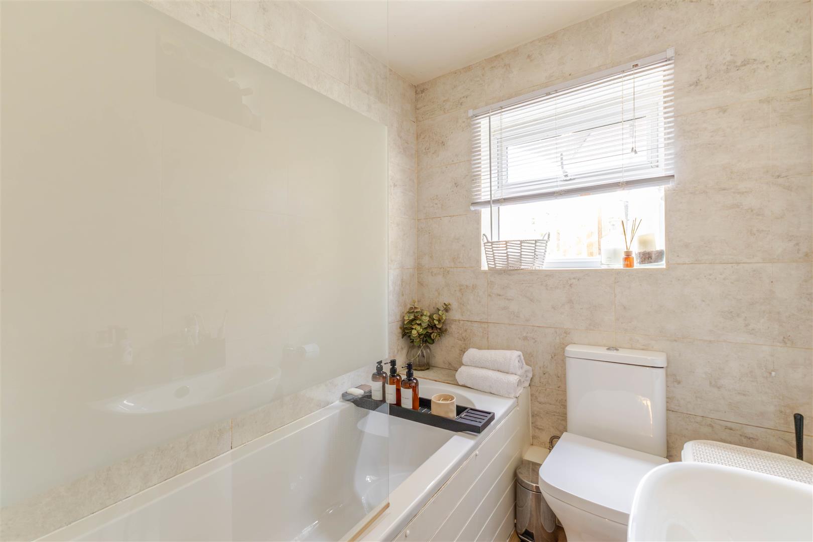 Comprising bath with shower over, low level w.c, wash hand basin, fitted cupboard housing washing machine & boiler, tiled walls, double glazed frosted window to the rear.
