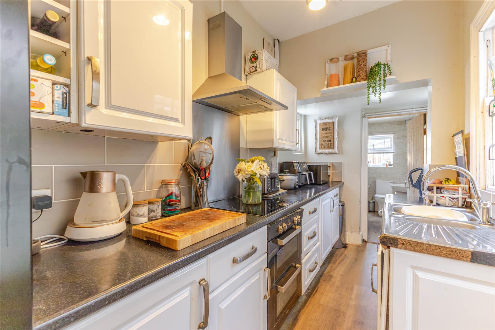 Comprising matching range of wall & base units, worksurfaces, inset stainless steel sink unit, inset electric hob with extractor hood over, fitted cooker, space for standing fridge/freezer, three windows, double glazed door to the garden. Door to