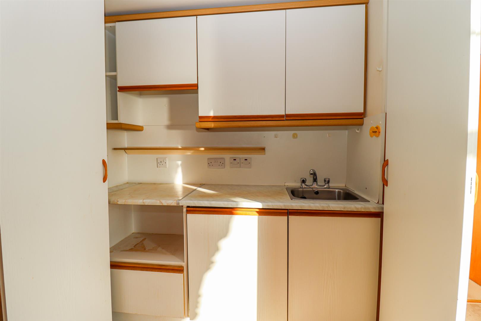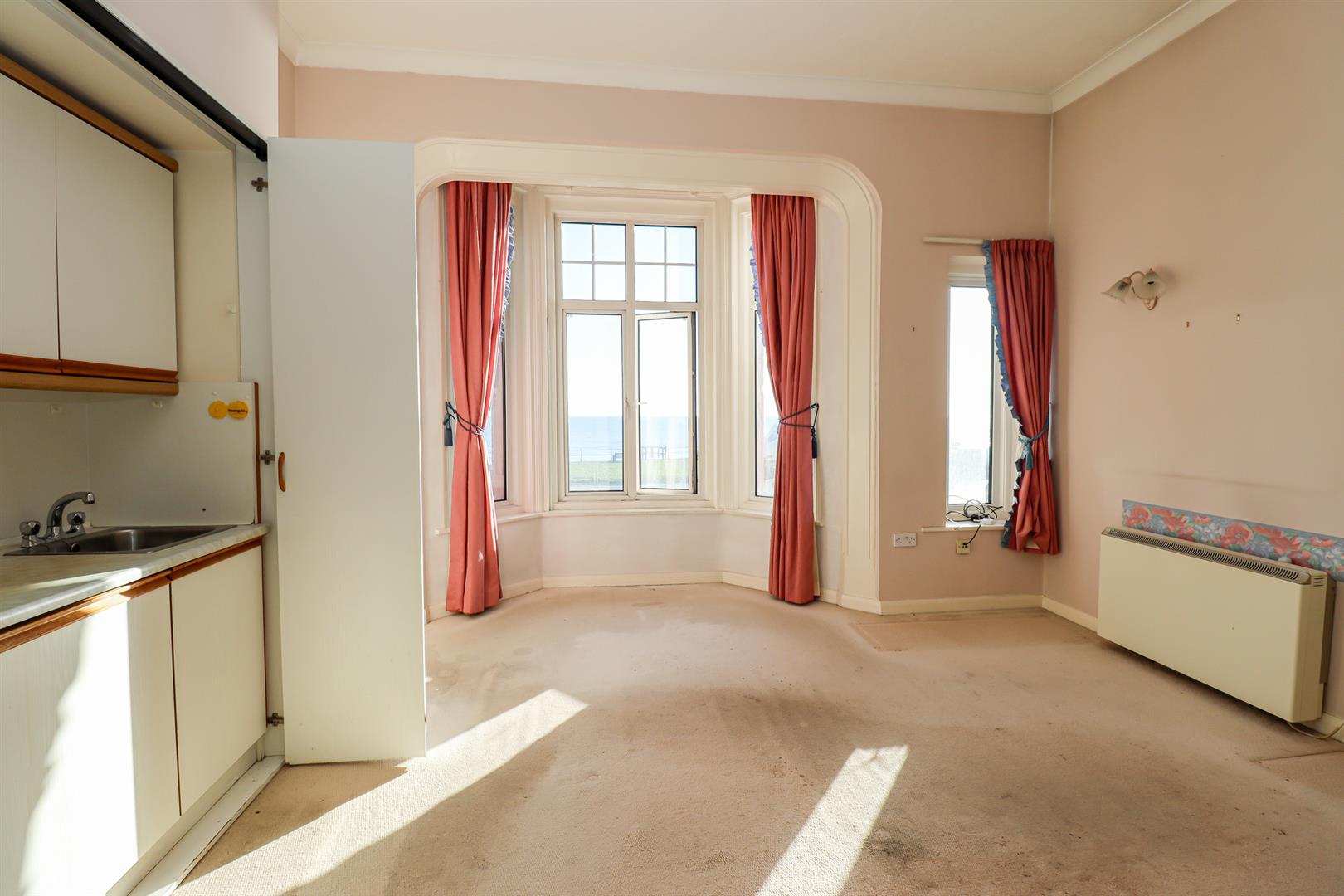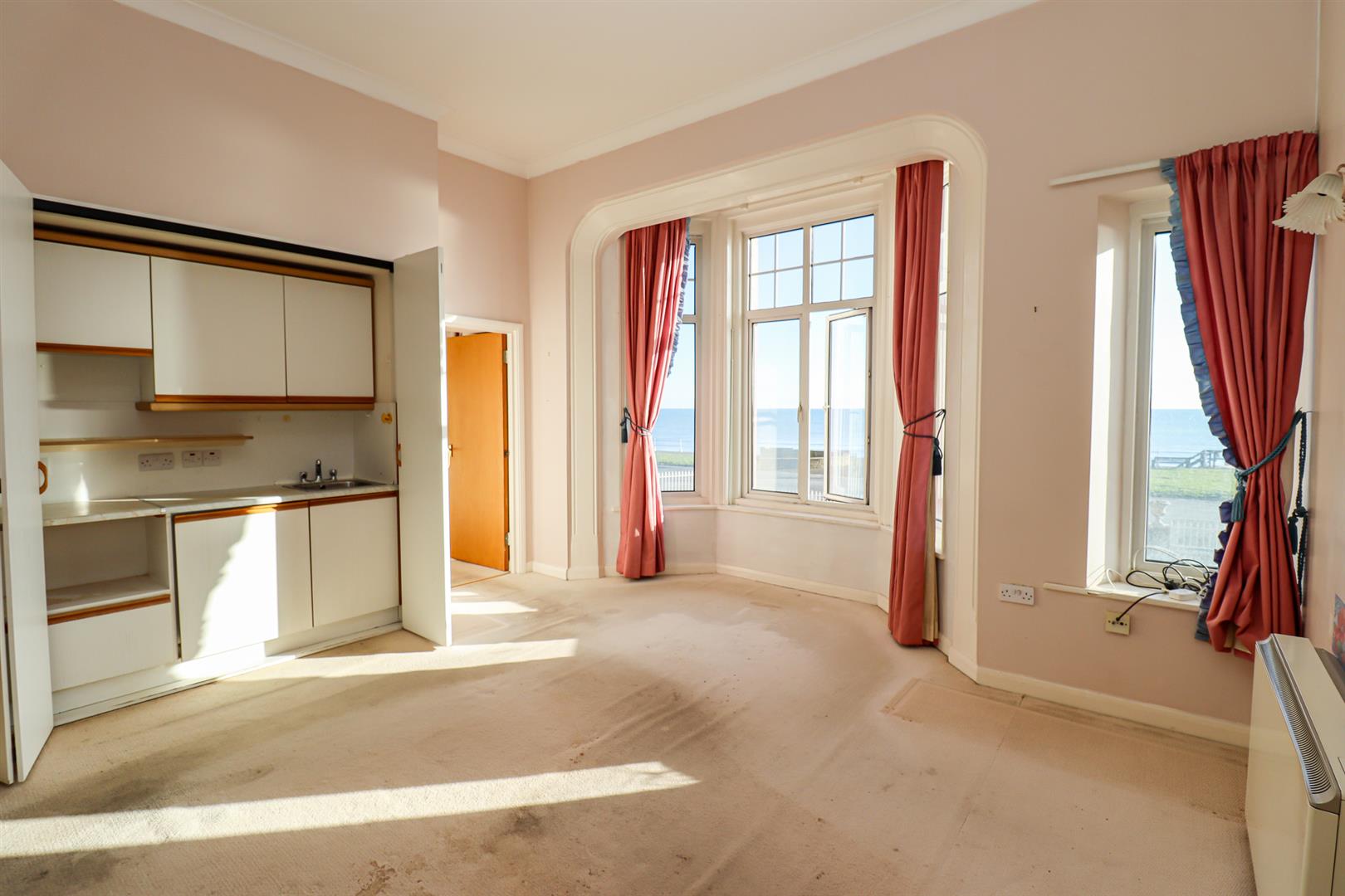 With two storage heaters, double glazed bay window overlooking the promenade & sea. Folding door to