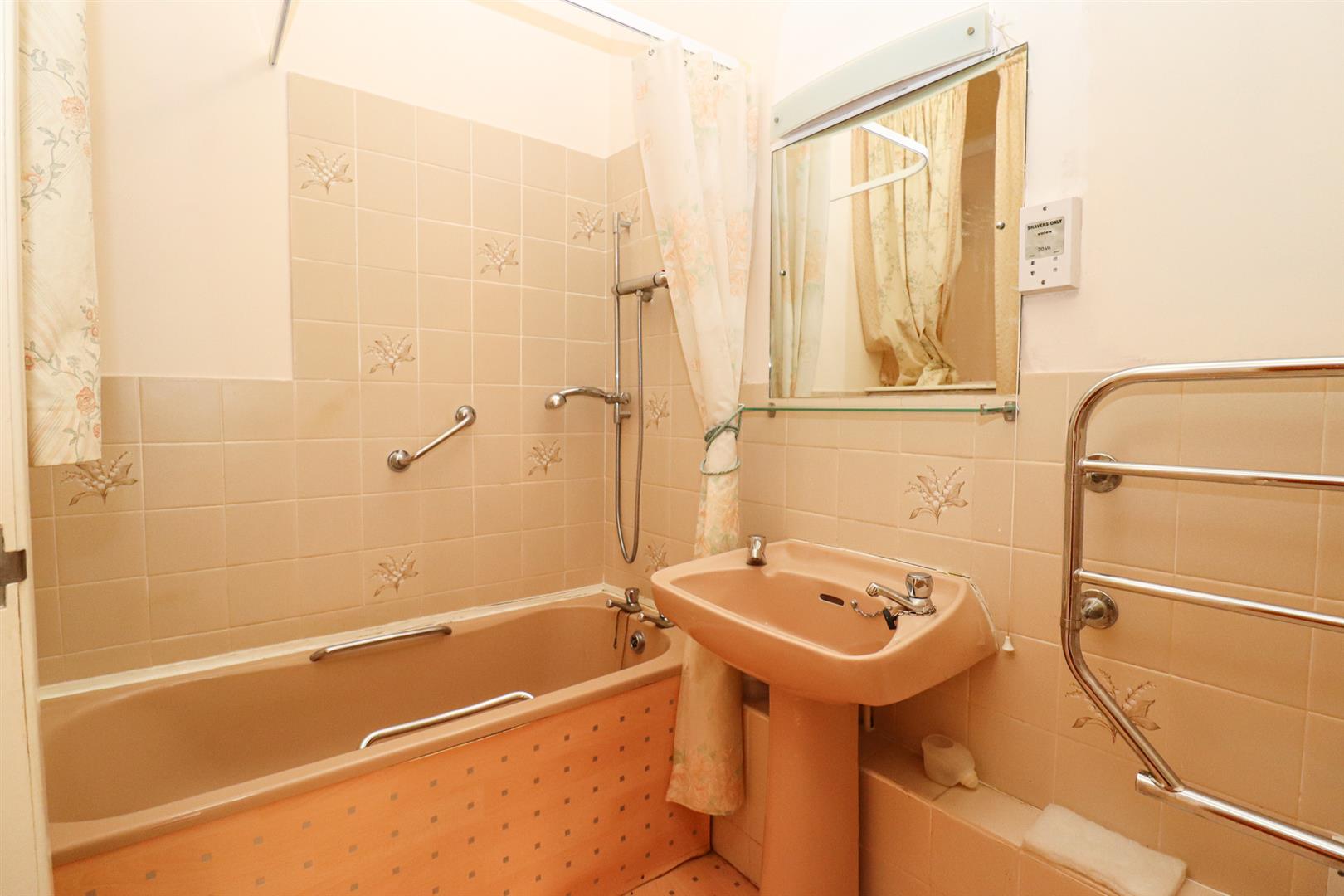 Comprising bath & shower over, fitted cupboard, pedestal wash hand basin, low level w.c, electric chrome heated towel radiator, shaver point, vanity mirror & light, borrowed light window.