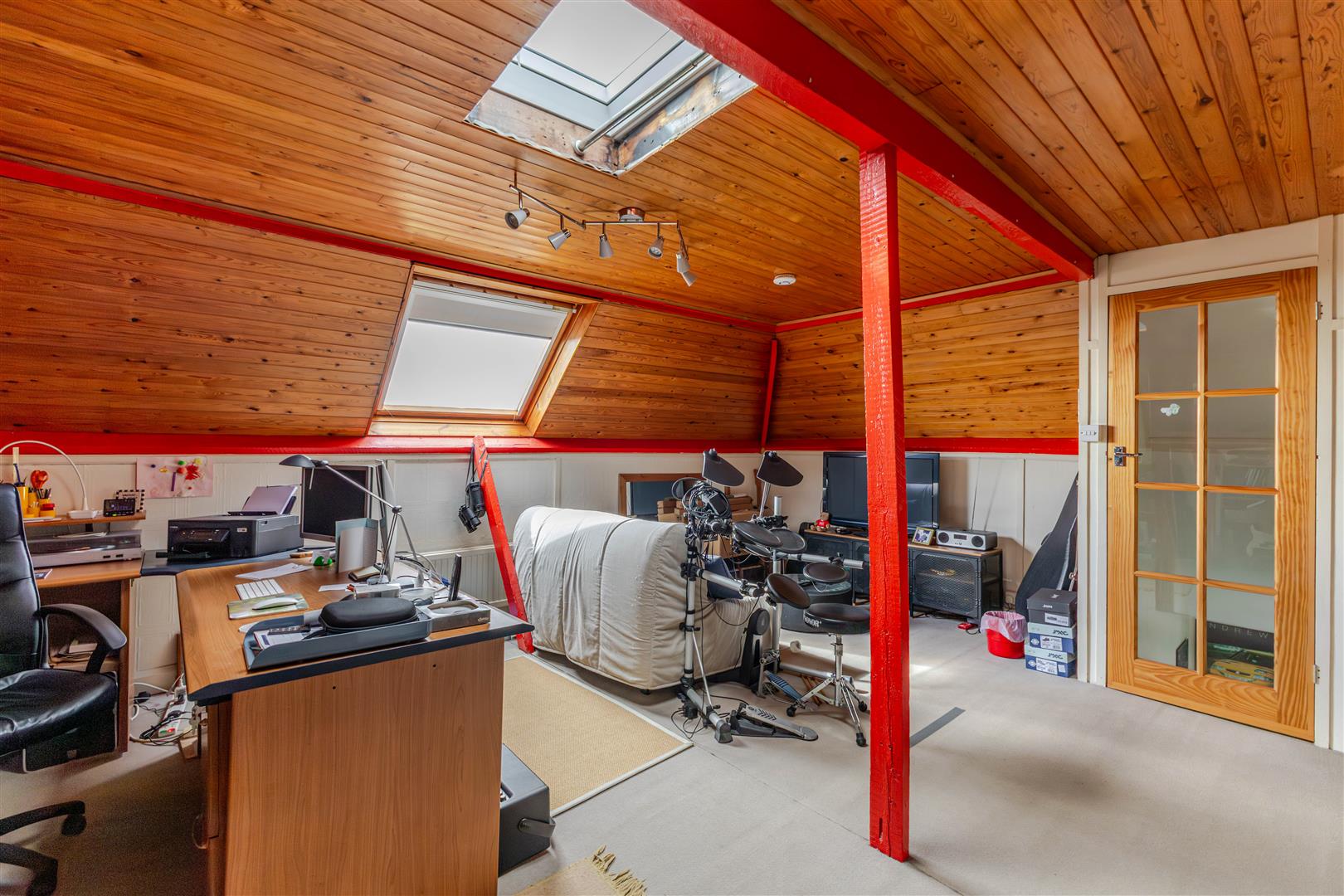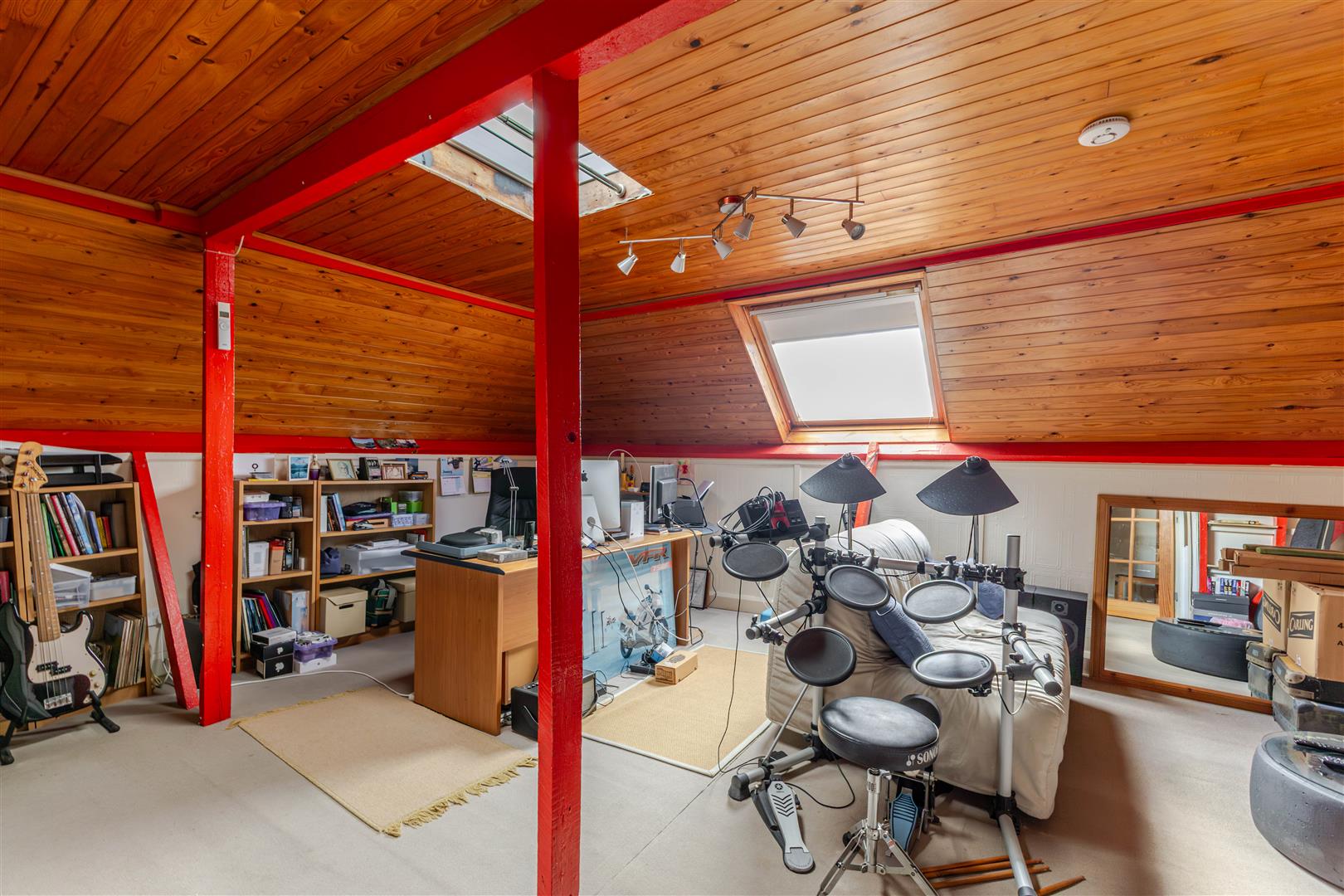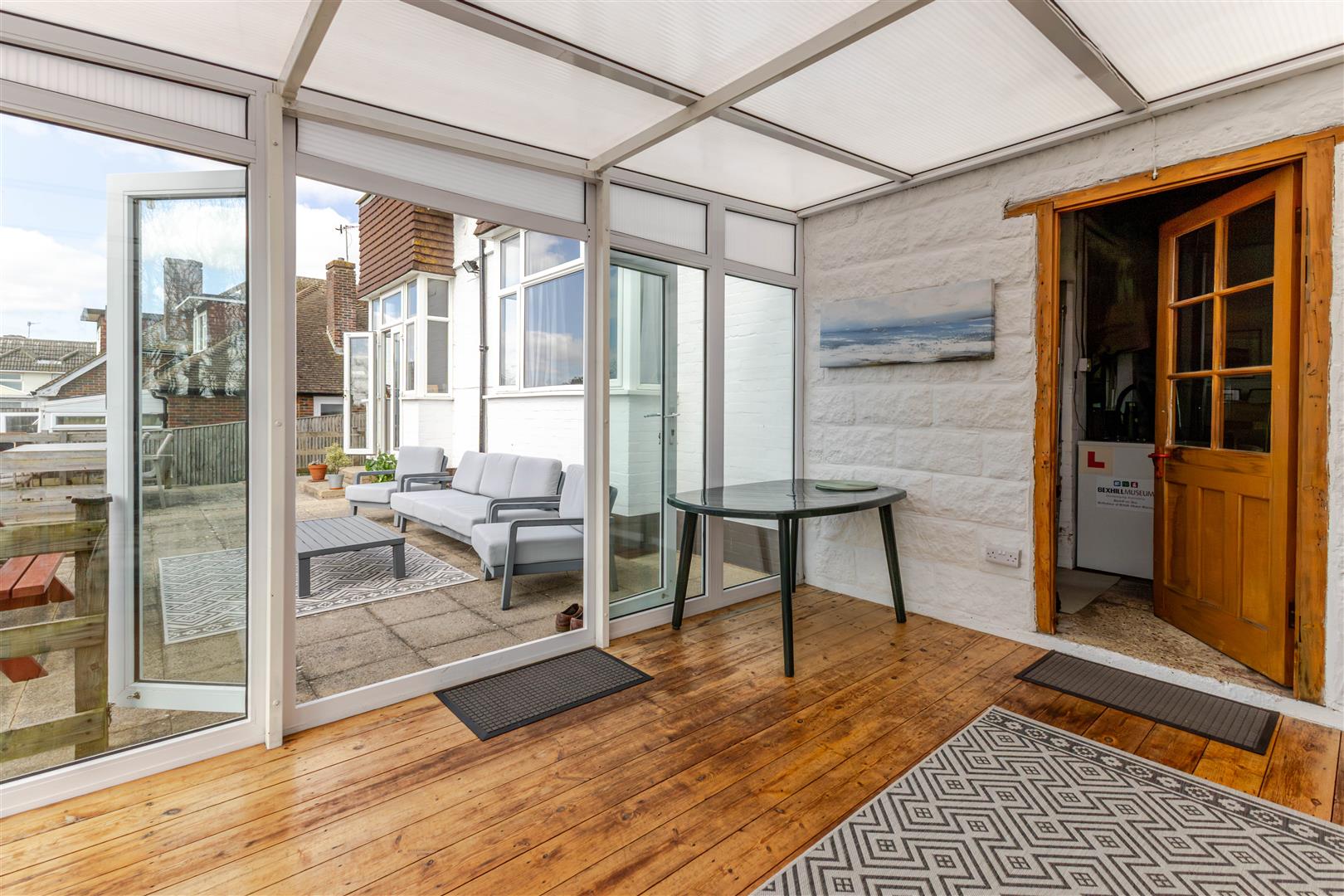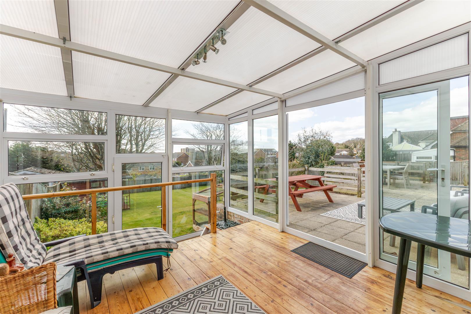 With wooden floor, double glazed windows, double glazed French doors to the side, steps down to double glazed door opening to the rear garden.