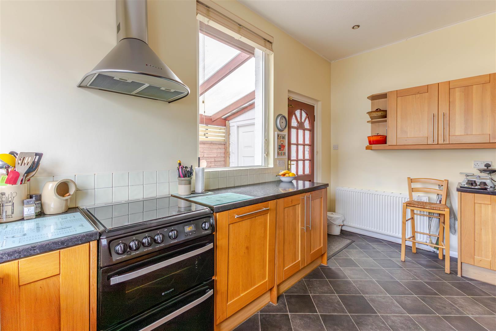 Comprising matching range of wall, base & drawer units, worksurfaces, inset stainless steel sink unit, space for cooker with extractor hood over, integrated dishwasher & fridge, radiator, double glazed window to the front, door to the side. Door to
