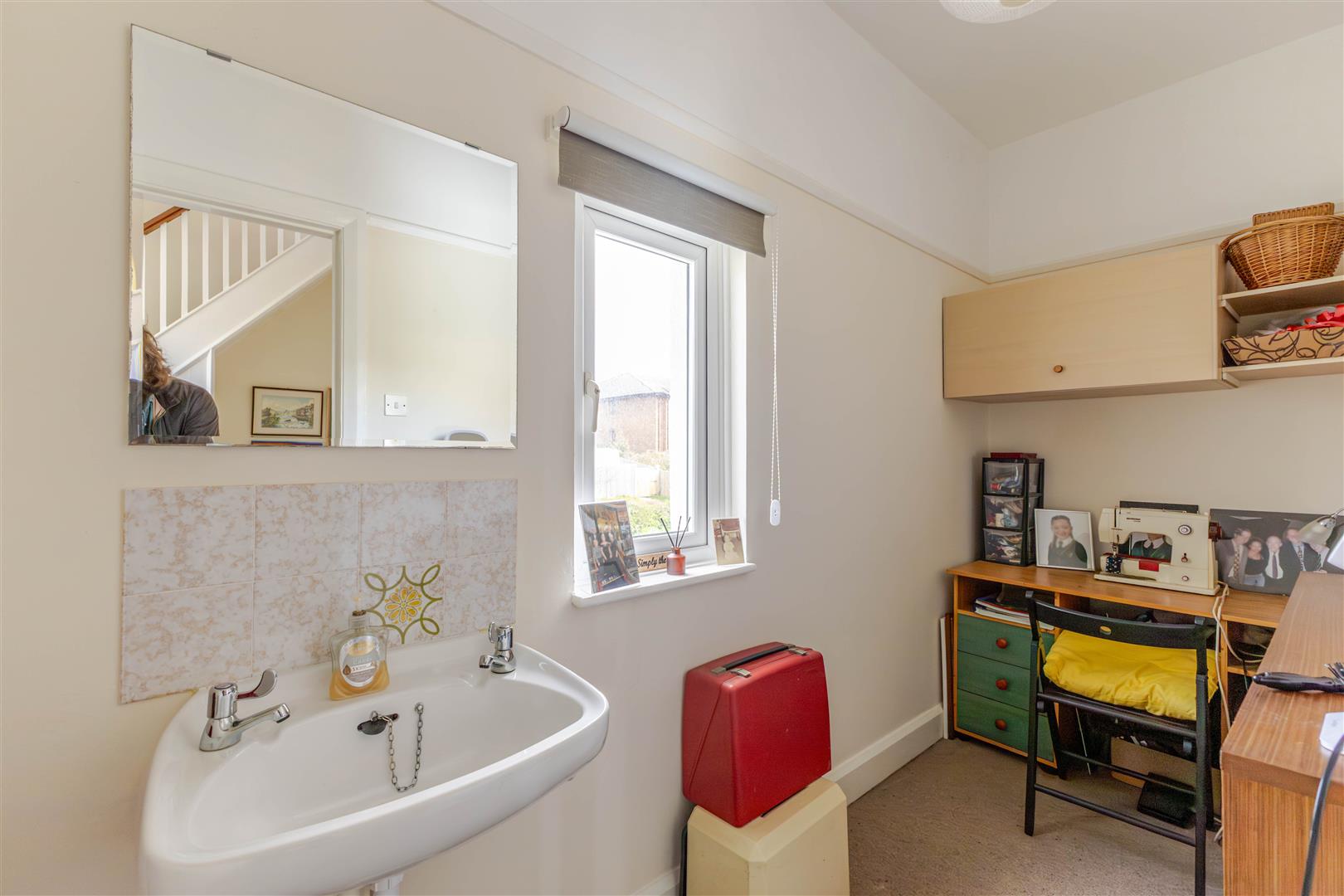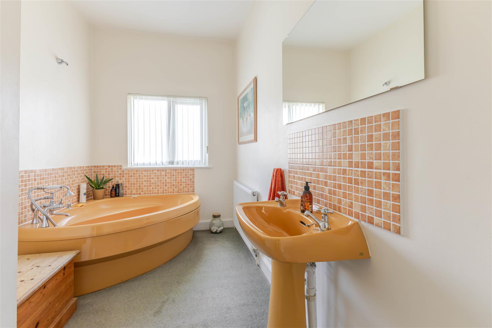 Comprising corner bath, pedestal wash hand basin, fitted cupboard, radiator, double glazed frosted window to the front.