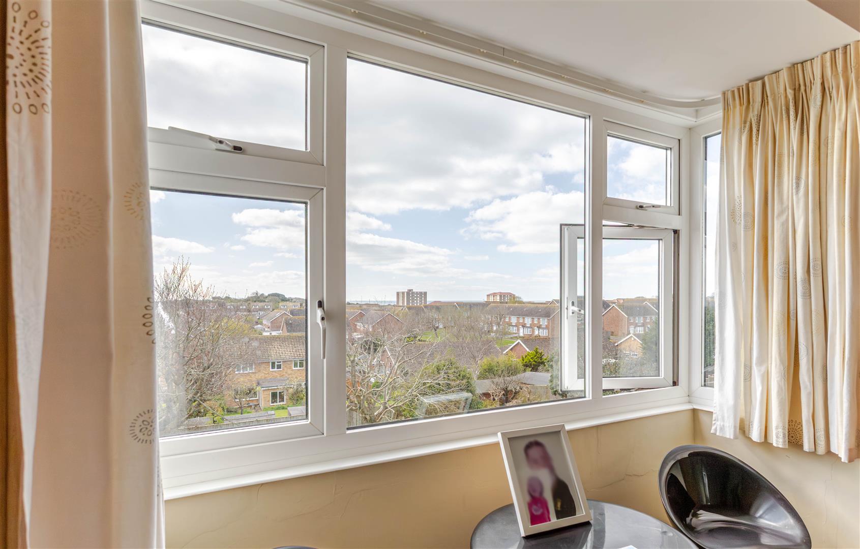 With radiator, fitted wardrobes, double glazed box bay window to the rear enjoying views towards the sea.