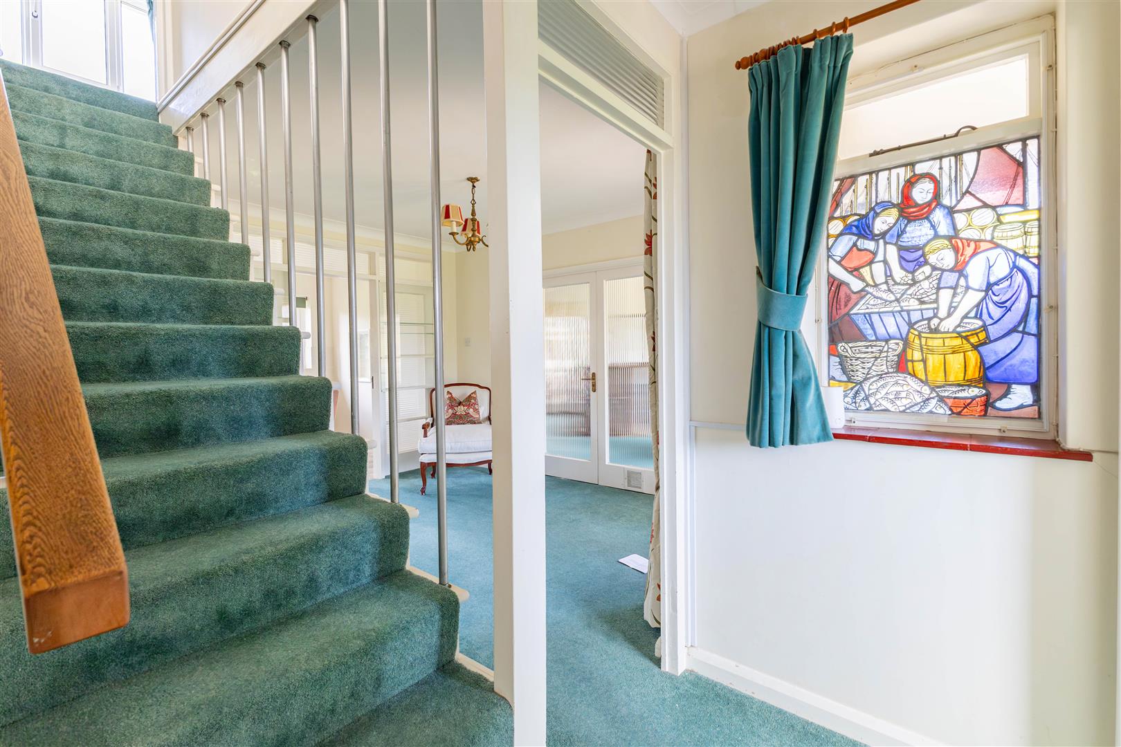 With storage heater, understairs storage cupboard, stairs to the first floor, double glazed frosted window, feature stained glass window to the side.