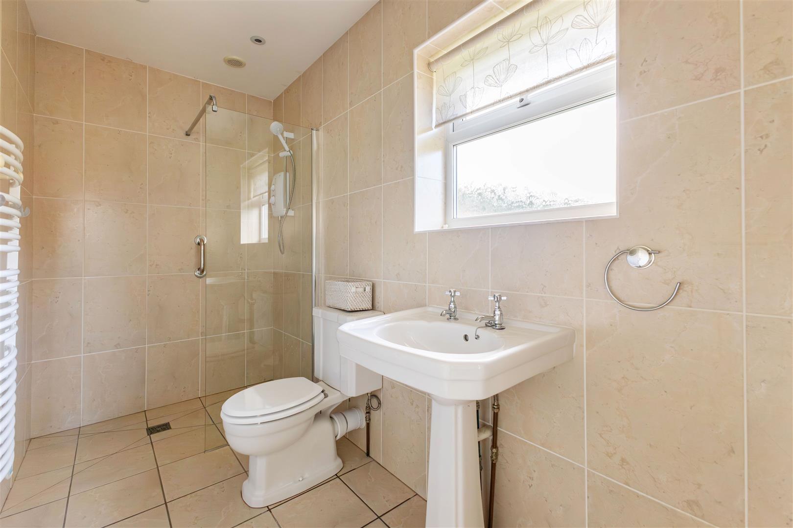 Comprising walk-in shower with electric shower & screen, low level w.c, pedestal wash hand basin, electric shaver point, tiled walls & floor, heated towel radiator, double glazed frosted window to the rear.