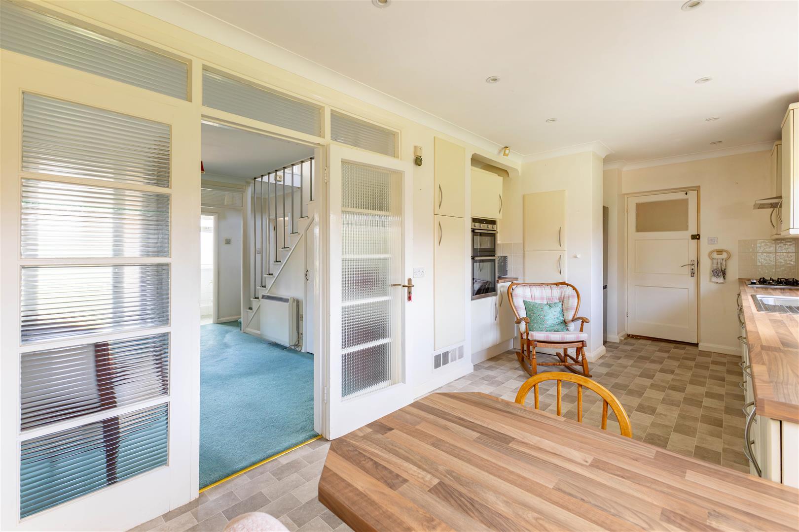 With storage heater, tiled floor, access to a boiler room housing gas central heating warm air system, door to garage, door to the rear garden.