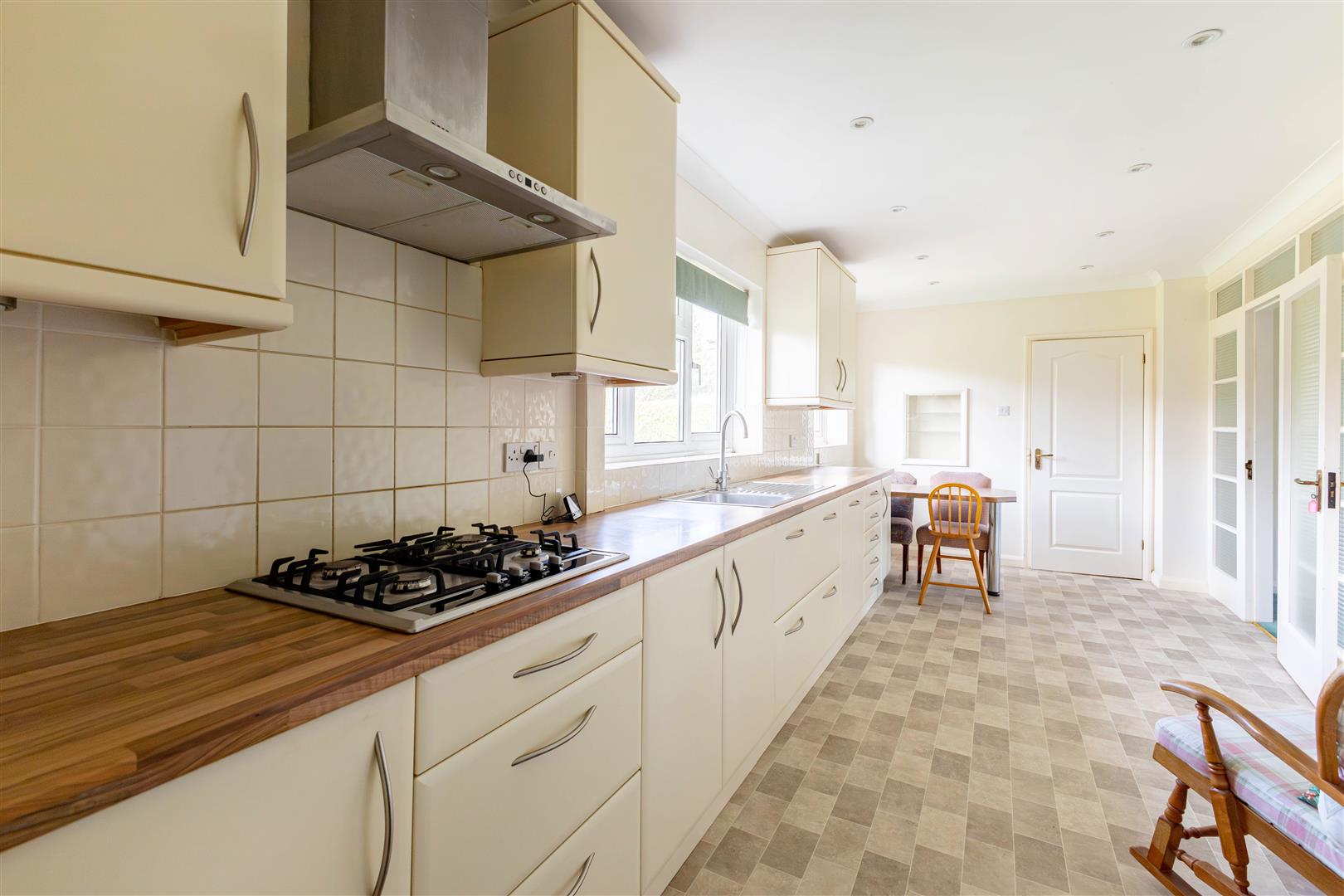 Comprising matching range of wall, base & drawer units, worksurfaces, inset stainless steel sink unit, inset gas hob with extractor hood over, fitted eye level double oven, integrated dishwasher, space for fridge/freezer, partly tiled walls, breakfast bar area, fitted cupboard housing meters, two double glazed windows to the rear. Door to rear lobby,