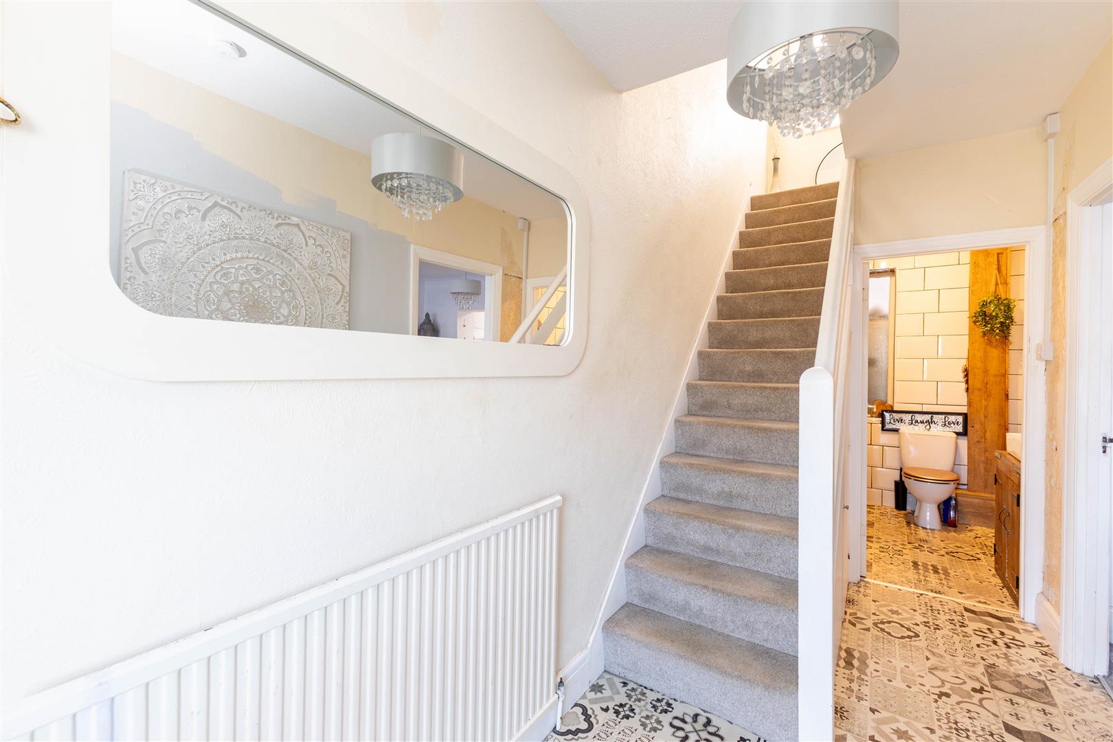 With radiator, understairs storage cupboard housing consumer unit & electric meter, stairs leading to the first floor.
