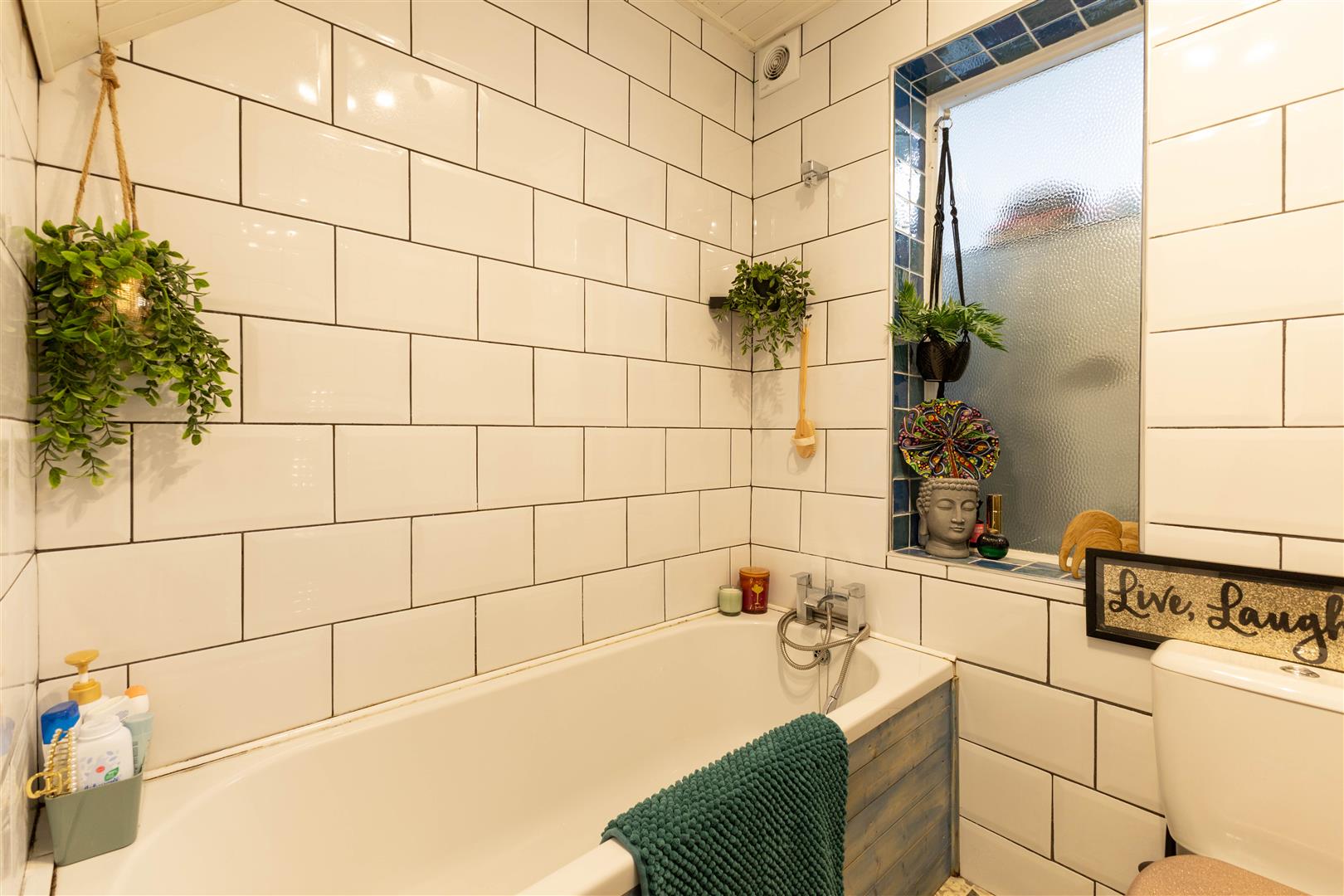 Modern suite comprising panelled bath with mixer tap & shower attachment, low level w.c, vanity unit with wash hand basin, tiled walls, extractor fan, chrome heated towel radiator, frosted glazed internal window to the rear.