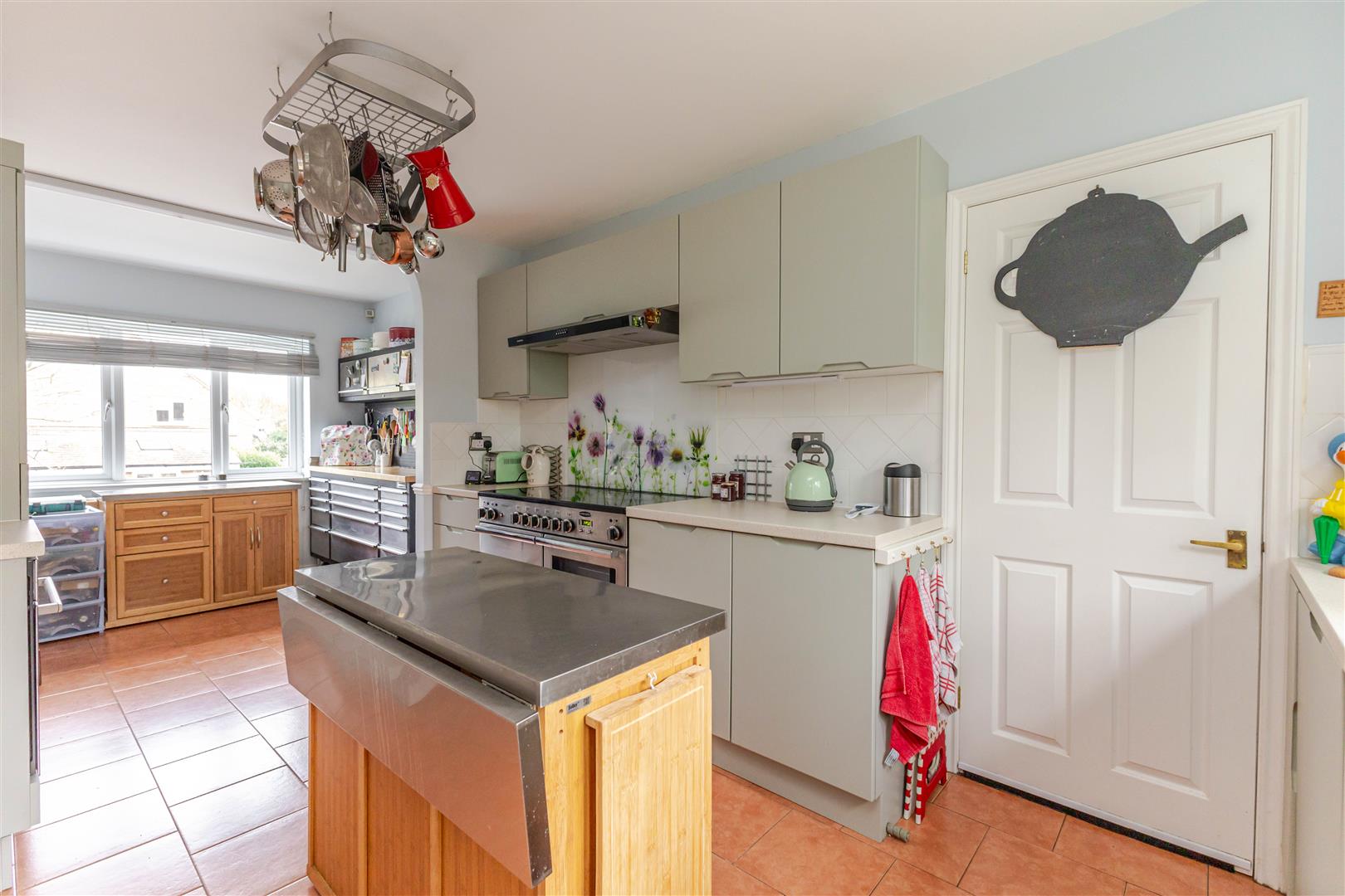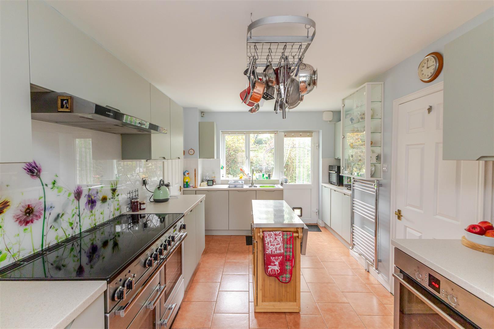 Comprising matching range of wall & base units, worksurfaces, inset stainless steel sink unit, Range master double oven, Klarstein extractor hood over, Bosch oven, integrated fridge/freezer, tiled floor, chrome heated towel radiator, space for table & chairs, radiator, double glazed window to the front & rear, double glazed door to the rear garden. Door to