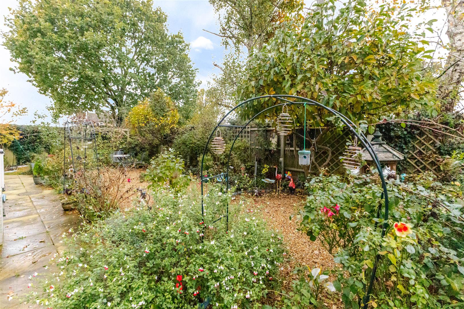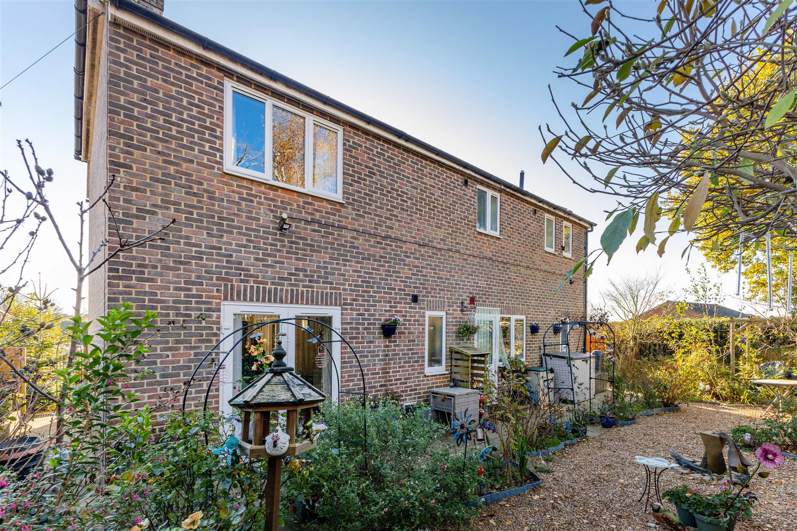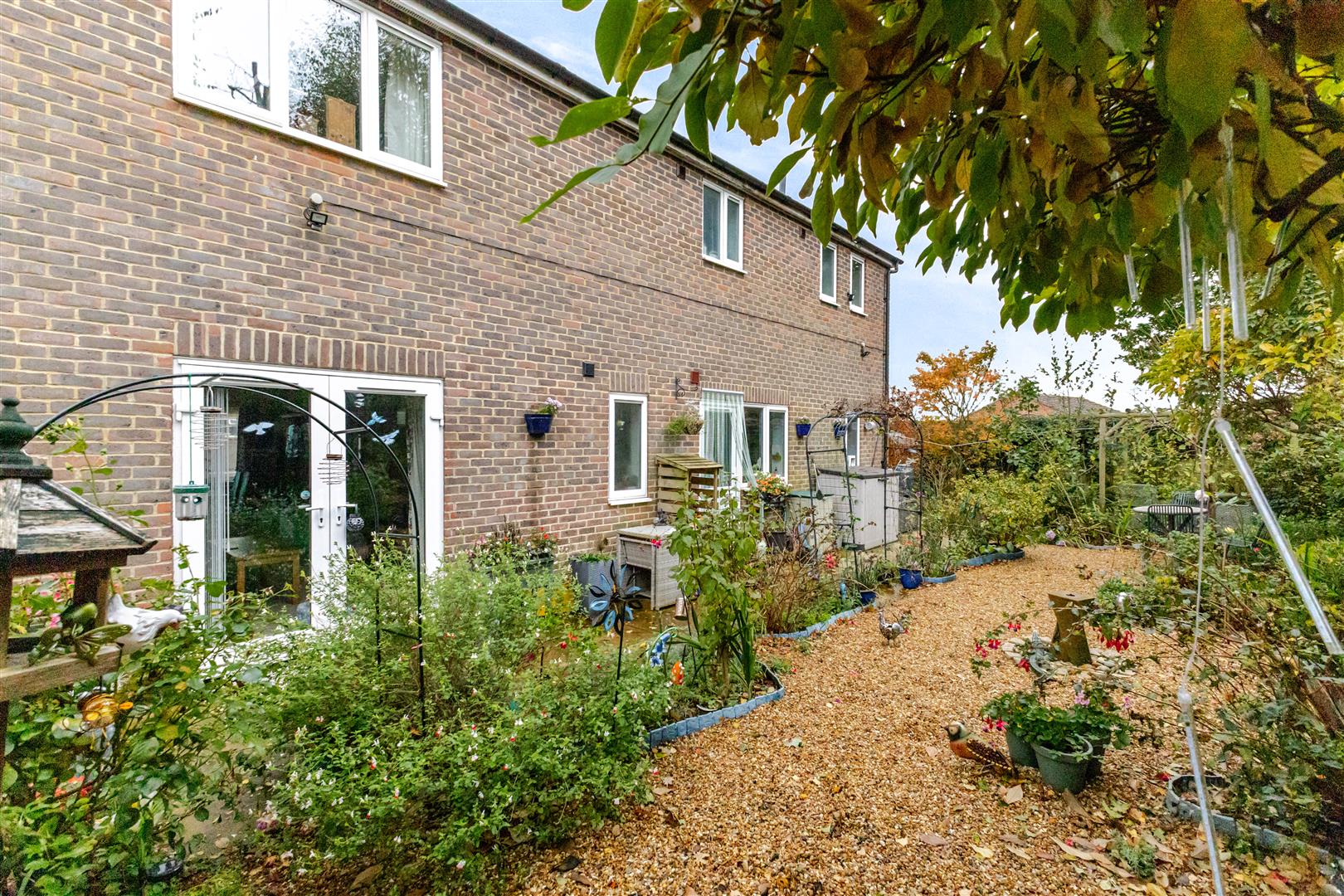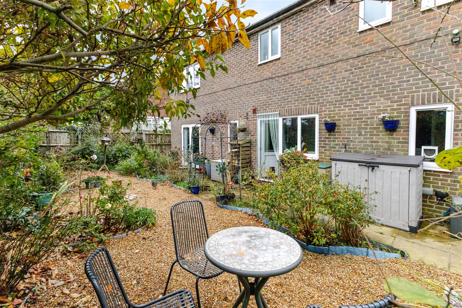 To the front there is a wall enclosed area of lawn, mature shrubs & trees, a block paved driveway providing off road parking leading to a garage. To the rear there is a patio area, an area of shingle, various shrubs & trees, a patio area, two garden sheds, air source heat pump, being enclosed by fencing with gated side access and further gate leading to Ninfield recreation ground.