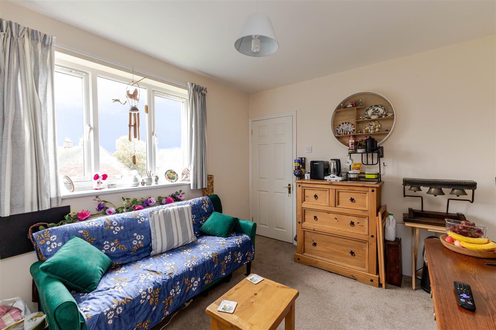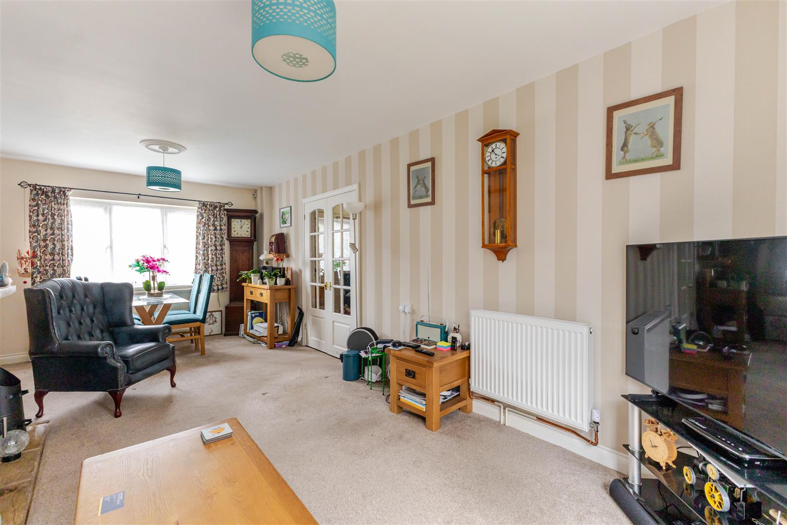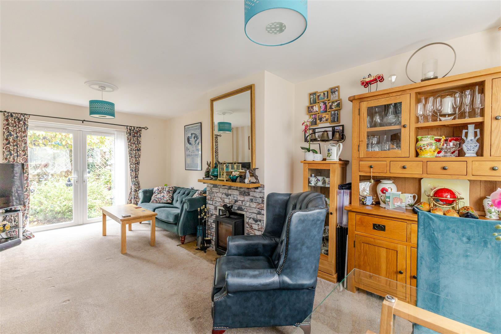 With two radiators, feature fireplace with wood burner, dual aspect with double glazed window to the front, double glazed French doors to the rear.