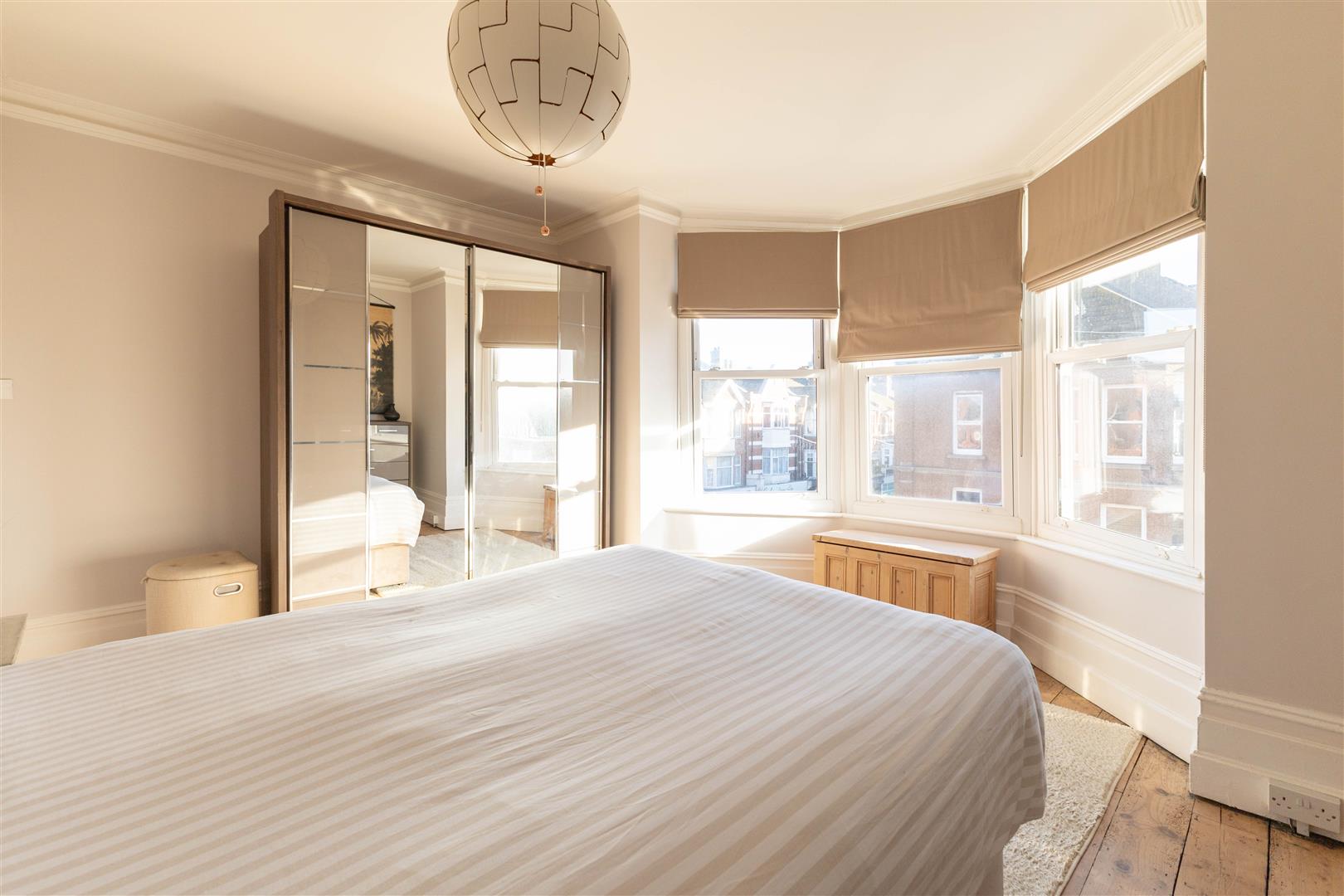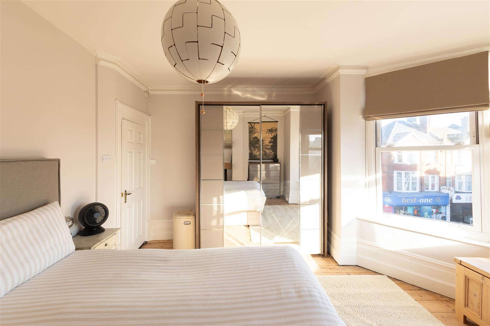 With feature fireplace, exposed wooden floor, wardrobe & chest of drawers, double glazed sliding sash window with views towards the sea.