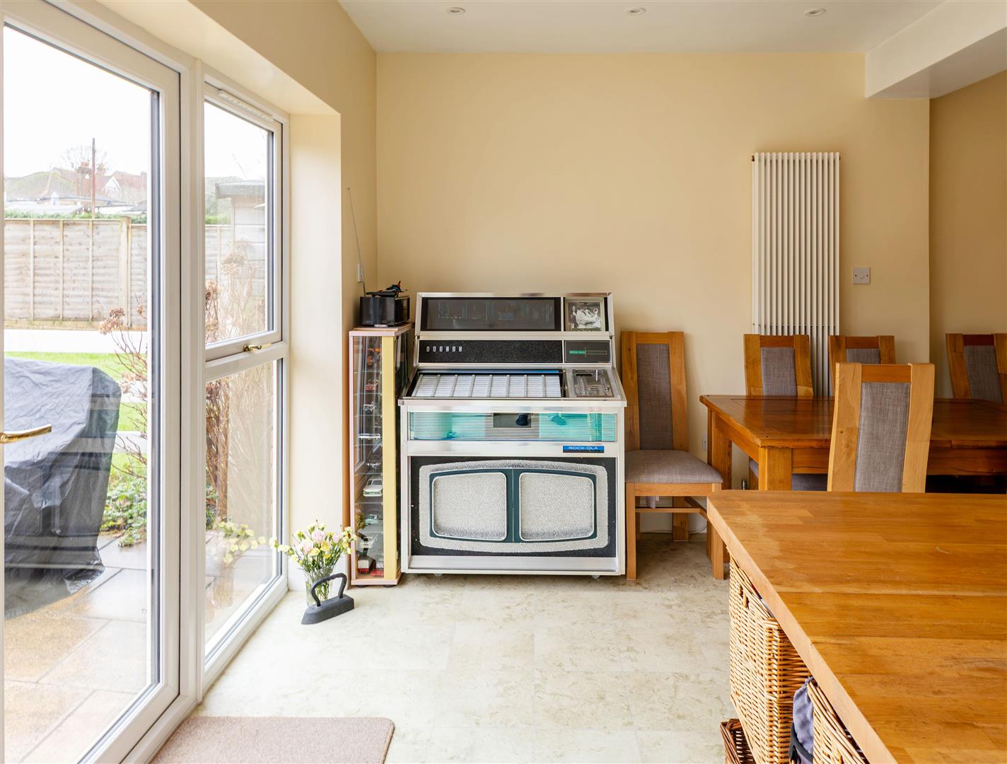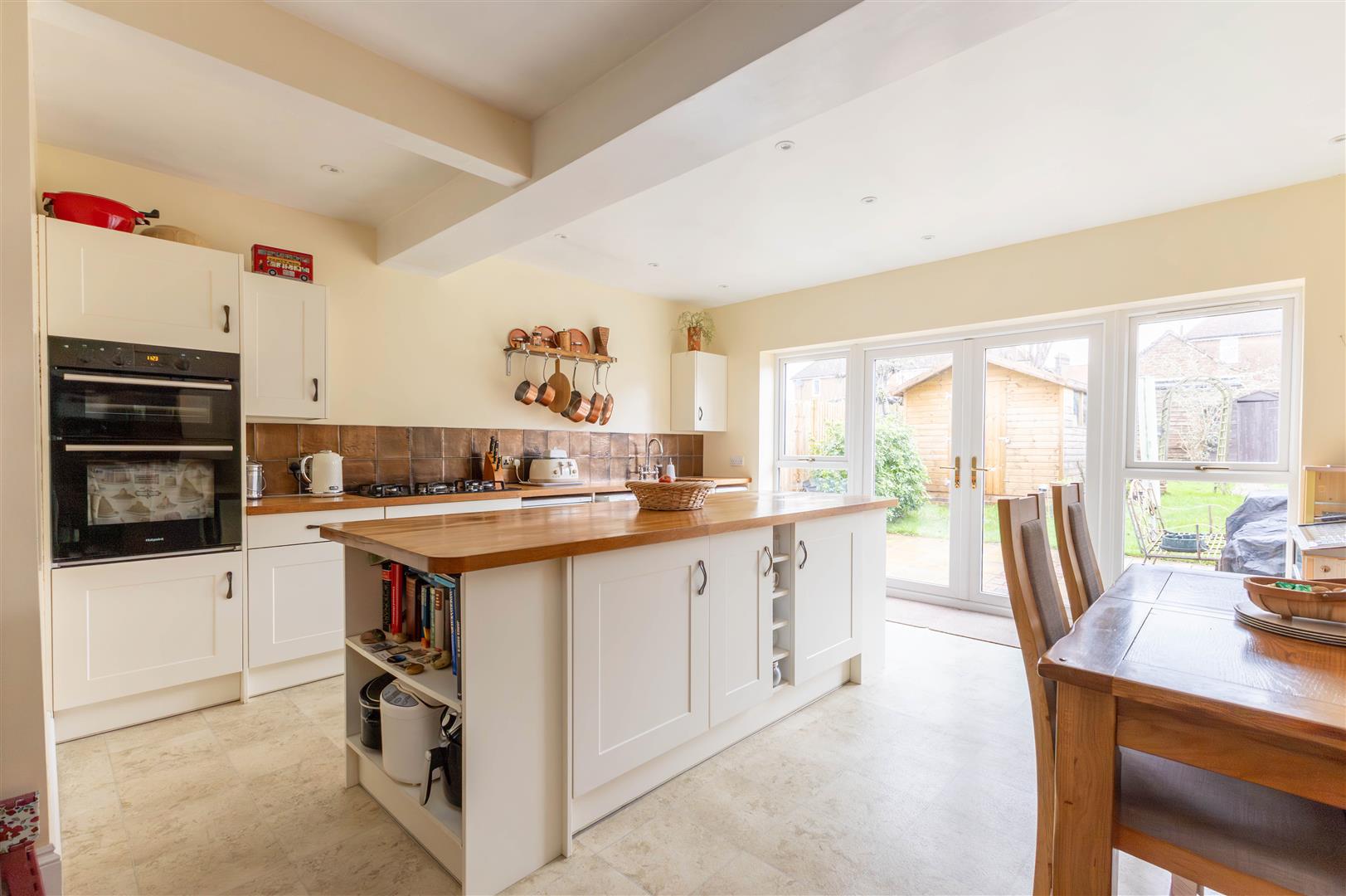 Comprising matching range of wall & base units, oak worksurfaces, inset sink unit, space for appliances to include dishwasher, washing machine, fridge & freezer, inset 5 ring gas hob, fitted eye level double oven, central island, wood burner, space for table & chairs, two vertical radiators, LED spotlights, double glazed window & door to the rear garden.