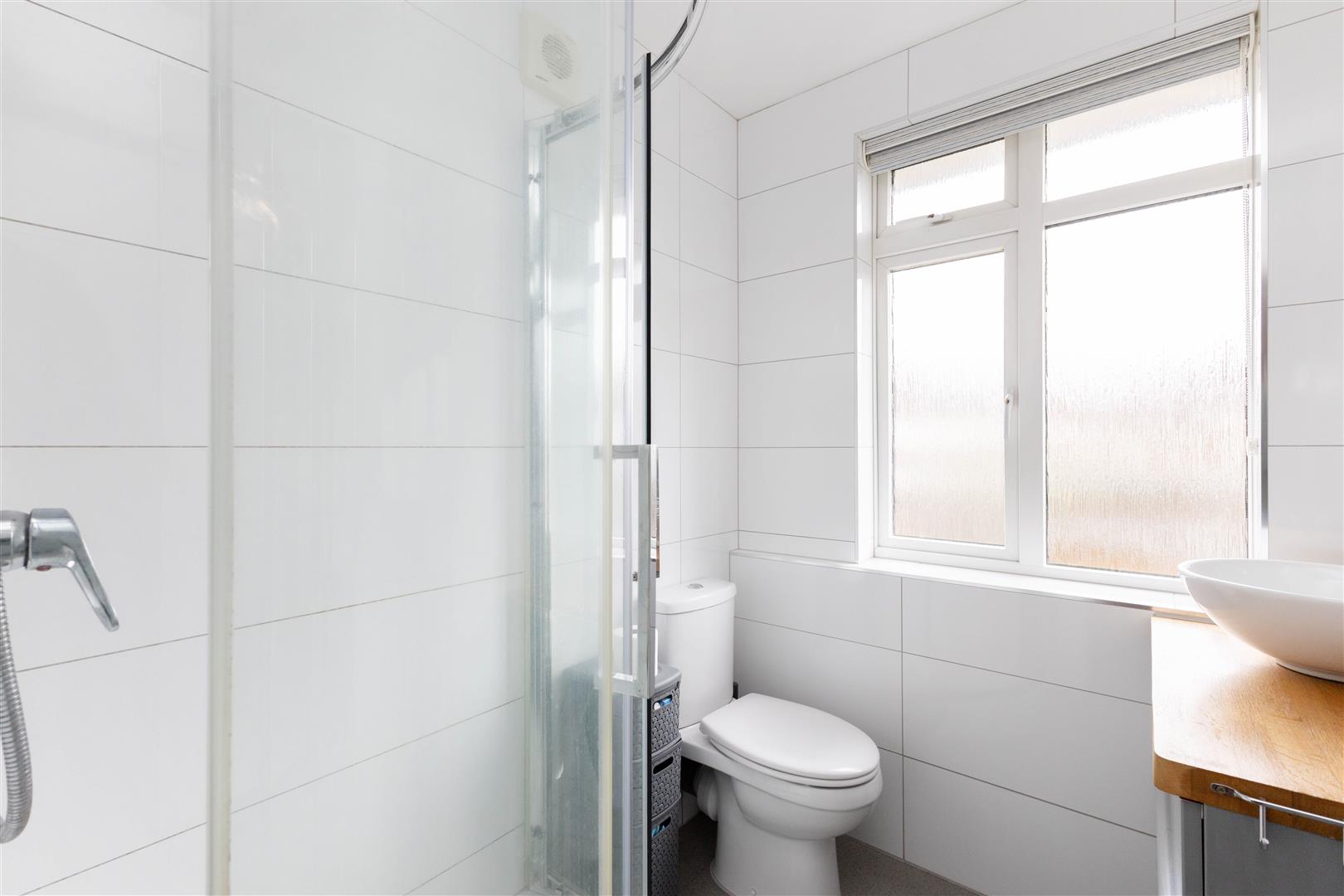 Comprising shower cubicle, vanity unit with inset wash hand basin, low level w.c, tiled walls, chrome heated towel radiator, double glazed frosted window to the rear.